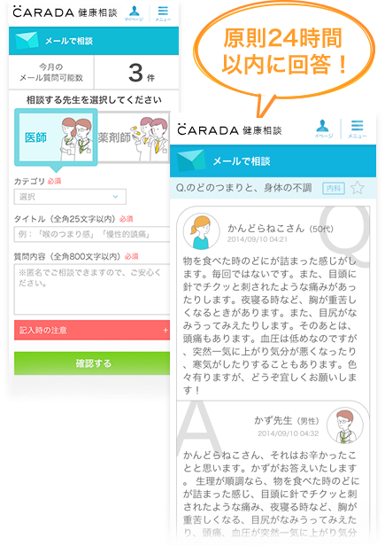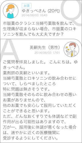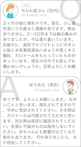 医師、薬剤師に相談できる回答しているのは全て現役の医師と、資格を持った薬剤師ですので、安心した回答が得られます |